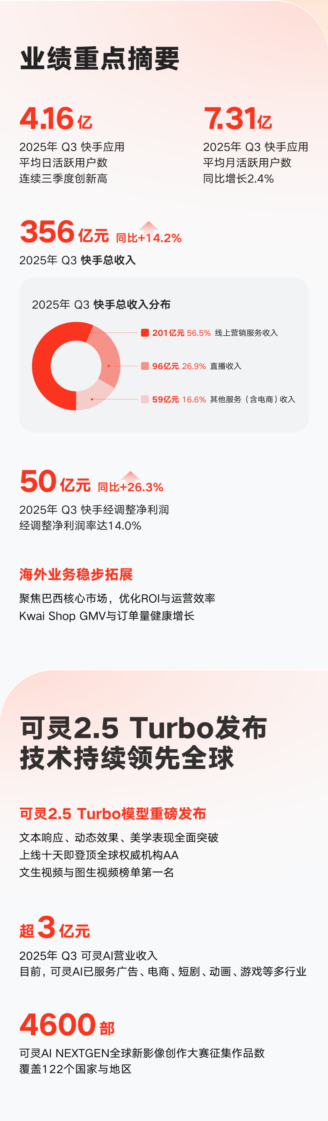 电商业务保持稳健增长态势,当季GMV达3850.44亿元,同比增长15.2%。其中泛货架电商占比突破32%,端到端生成式检索架构OneSearch推动商城搜索订单量提升近5%,OneRec模型的应用使商城信息流GMV实现高单位数增长。用户价值深度挖掘成效显著,每位日活用户平均线上营销服务收入从去年同期的43.3元增至48.3元。