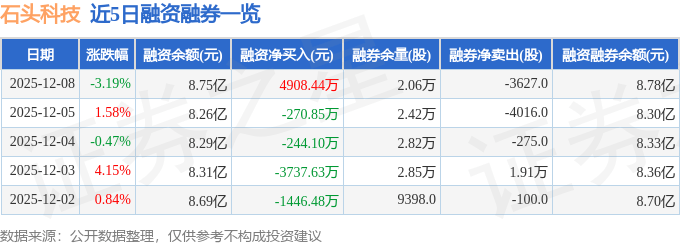 在融资融券方面,石头科技当日融资买入额为8891.28万元,融资偿还额为3982.84万元,融资净买入额达到4908.44万元。融券交易方面,公司融券卖出2072.0股,融券偿还5699.0股,融券余量维持在2.06万股,融券余额为323.49万元。截至当日,公司融资融券余额总计为8.78亿元。