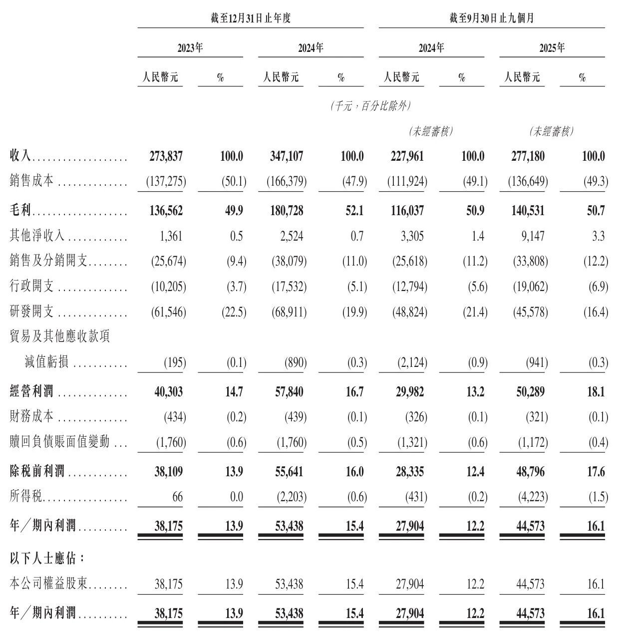 从财务数据来看,睿云联创近年来表现出稳健的增长态势。2023年,公司实现营收2.74亿元,毛利1.37亿元,期内利润达到3818万元,利润率维持在13.9%的水平。到了2024年,营收进一步增长至3.47亿元,毛利提升至1.81亿元,期内利润也增至5344万元,利润率提高至15.4%。进入2025年前9个月,公司营收已达2.77亿元,毛利为1.41亿元,经营利润和期内利润分别为5029万元和4457万元,显示出强劲的增长动力。