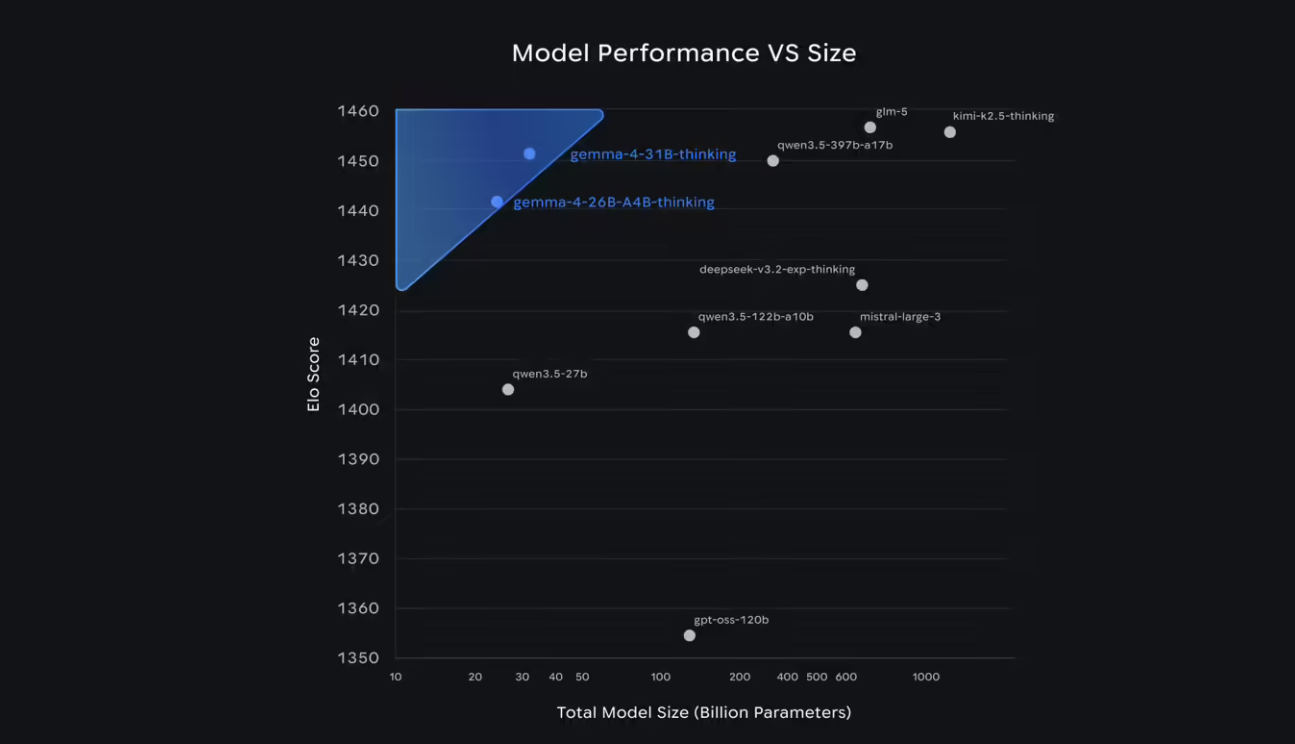 Gemma 4推出四种规格模型,涵盖从端侧设备到数据中心的全场景需求:20亿参数的E2B与40亿参数的E4B主打端侧部署,260亿参数的混合专家模型(MoE)和310亿参数的稠密模型(31B)则面向高性能计算场景。所有模型均突破传统对话应用边界,在数学推理、代码生成、多模态处理等复杂任务中展现卓越能力。其中31B模型在Arena AI文本生成基准测试中位列全球开源模型第三,26B模型排名第六,性能超越参数规模20倍的同类模型。