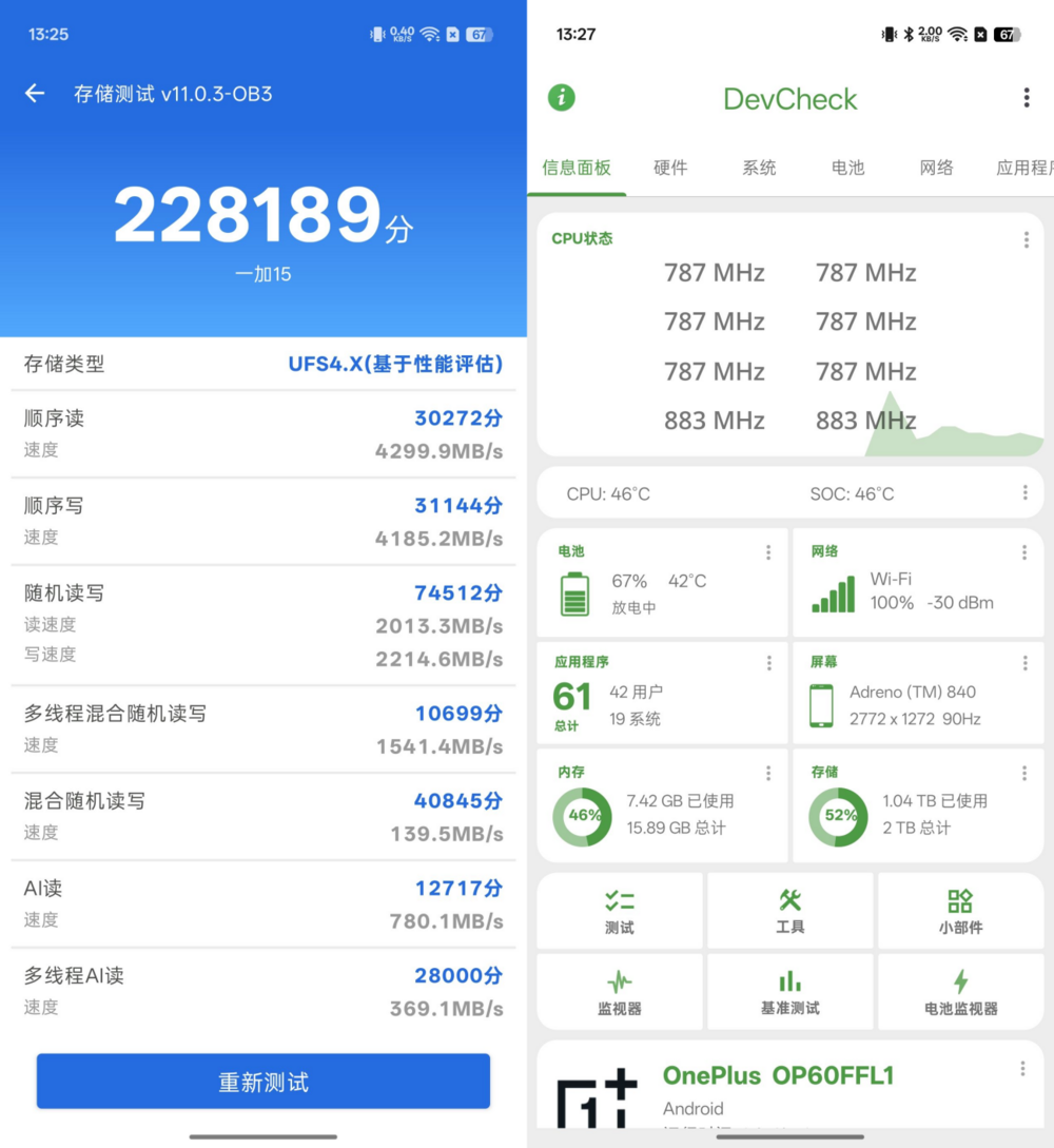 性能方面,一加15以硬件旗舰级与优化芯片级为核心,通过第五代骁龙8至尊版移动平台、LPDDR5X Ultra内存、UFS 4.1闪存的组合,实现闪存读写突破4.2GB/s。第五代骁龙8至尊版采用台积电3nm N3P工艺,CPU为2超大核+6性能核的全大核阵容,GPU为全新Adreno 840。而“风驰游戏内核”则通过调动CPU、GPU、NPU能力,重构性能释放、渲染管线与调度逻辑,带来最优单帧功耗控制与行业最强1%Low帧表现。实测中,《王者荣耀》平均帧率达120.1fps,5% low帧为115.2fps,整机温度38℃;《和平精英》平均帧率143.6fps,5% low帧为139.2fps,温度40℃。一加应用商城已开设165Hz专区,热门游戏适配后,配合灵犀触控技术(瞬时采样3200Hz,支持330Hz五指触控与290Hz十指触控),游戏体验流畅无延迟。