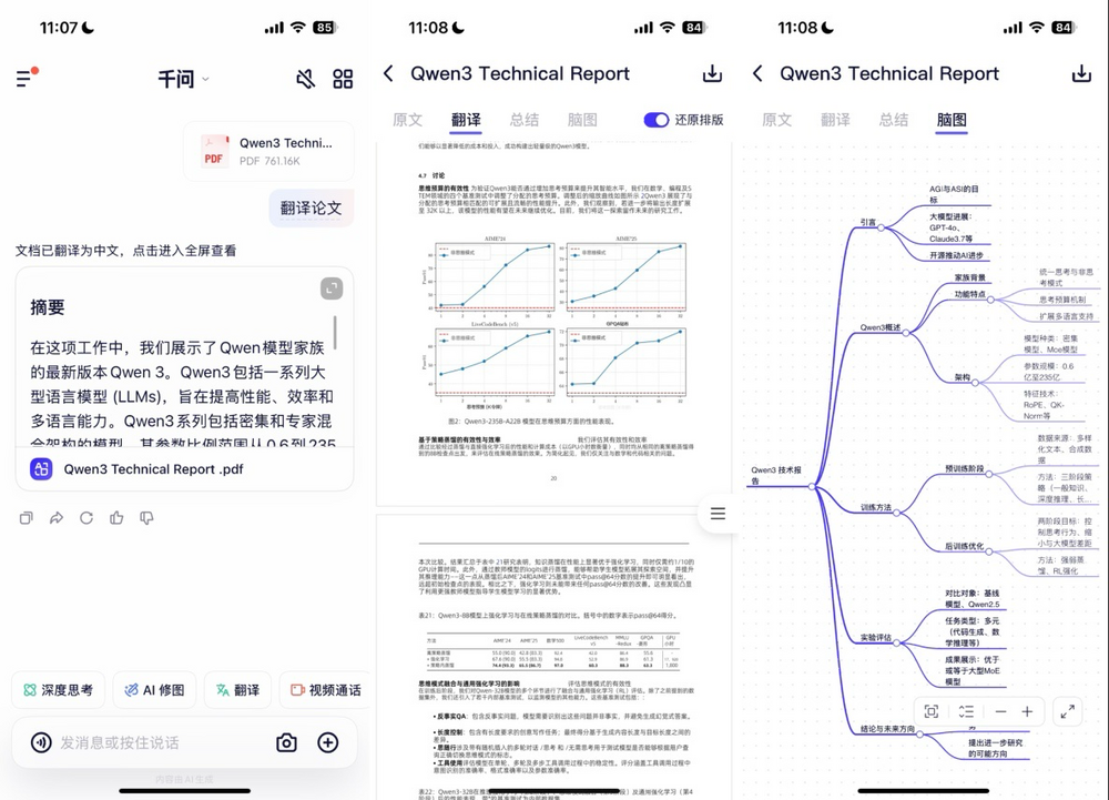 针对不同用户的使用习惯,千问App提供了灵活的阅读模式选择,包括分屏对照、逐句对照和纯译文模式。依托Qwen大模型对专业术语和上下文语义的深度理解,翻译结果在专业性和连贯性上均有显著提升,尤其适合学术研究、商务沟通等场景。