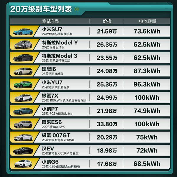 测试结果显示,小米SU7最低配版本搭载73.6度电池,官方标注CLTC续航为700公里,实际行驶里程达到384公里,续航达成率高达54.86%,在20万元价格组别中位列榜首。另一款车型YU7最入门版配备96.3度电池,官标CLTC续航835公里,最终以420公里的实际行驶里程成为同组别中续航最远的车型。两款车型的真实电耗分别为22.5kWh/100km和25.9kWh/100km,展现出优秀的能耗管理水平。