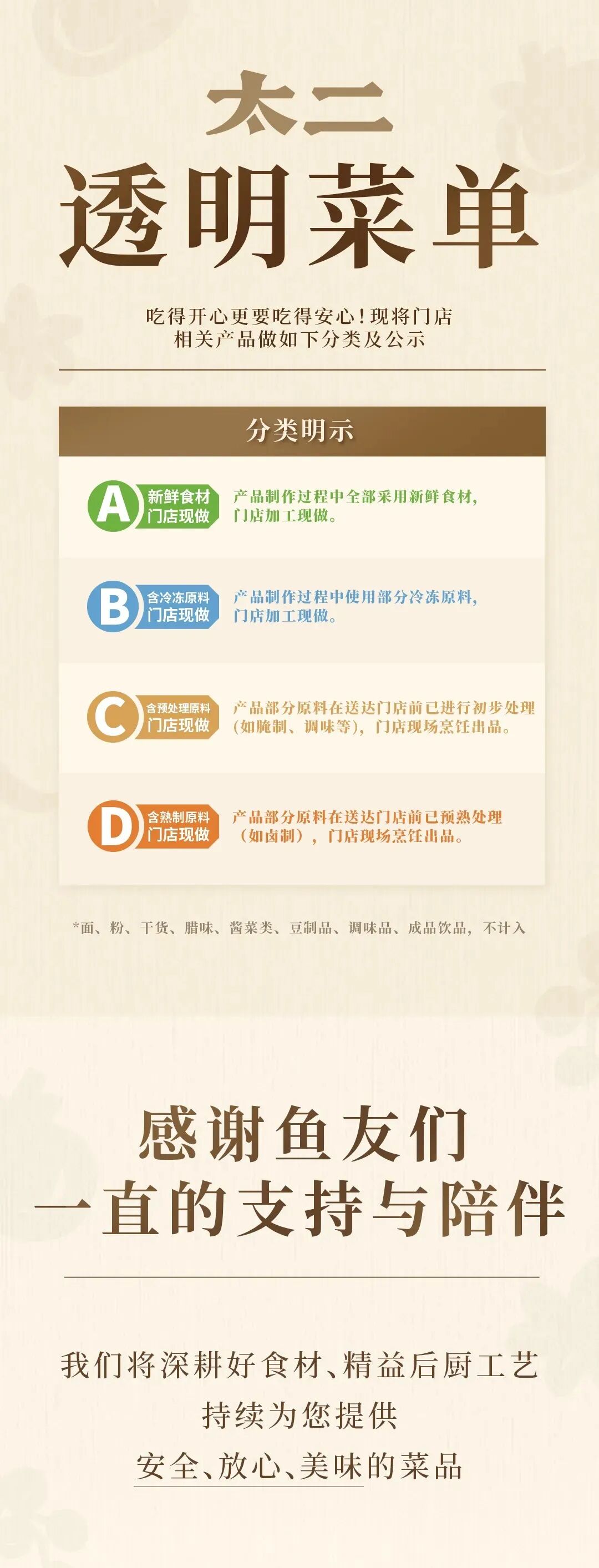太二酸菜鱼官方表示,这一制度不仅适用于自身品牌,还同步覆盖了母公司九毛九集团旗下的多个餐饮品牌。消费者可以根据菜单分类,直观选择不同食材处理方式对应的菜品,满足多样化的饮食需求。此次改革体现了品牌对食材品质和透明度的重视,也为行业树立了新的标杆。