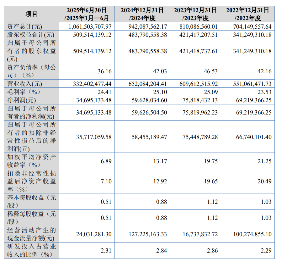 财务数据显示,2022年至2025年上半年,培源股份实现营业收入分别为5.51亿元、6.1亿元、6.52亿元和3.32亿元;同期净利润分别为6921.94万元、7581.84万元、5962.8万元和3469.51万元。尽管净利润在2024年出现小幅波动,但公司整体营收规模仍保持增长态势,显示出较强的市场适应能力。
