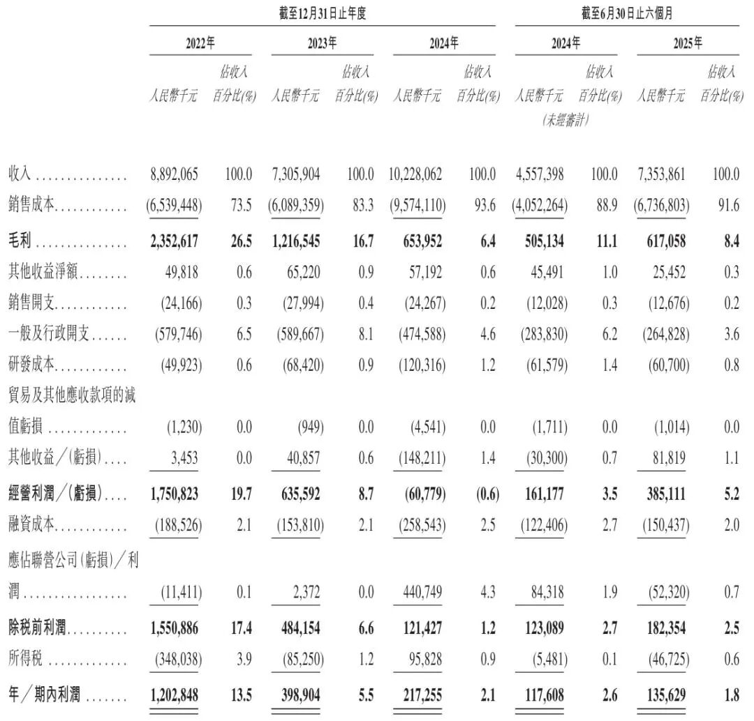 进入2025年后,公司业绩出现回暖迹象。上半年实现营业收入73.54亿元,较上年同期的45.57亿元增长显著;毛利达6.17亿元,高于去年同期的5.05亿元。不过毛利率仍维持在8.4%的较低水平,较上年同期下降2.7个百分点。经营利润为3.85亿元,经营利润率5.2%;期内利润1.36亿元,对应利润率1.8%。