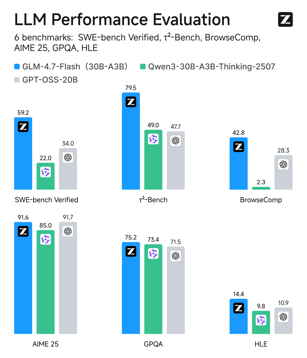在性能表现方面,GLM-4.7-Flash在主流基准测试中成绩斐然。在SWE-bench Verified、τ²-Bench等测试中,其综合表现超越了gpt-oss-20b、Qwen3-30B-A3B-Thinking-2507等模型,在相同和近似尺寸模型系列中斩获开源SOTA分数,充分彰显了该模型的强大实力。