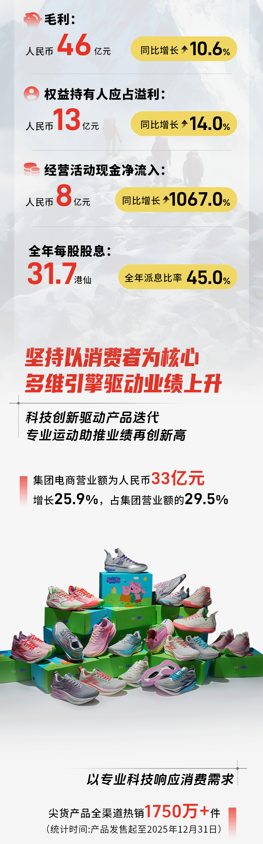 361度集团近日公布2025年度财务数据,全年收益达111.46亿元人民币,较上年增长10.64%;股东应占溢利为13.09亿元,同比增长13.95%;每股盈利63.3分,末期派息每股11.3港仙。集团在渠道升级与全球化布局的双重驱动下,业务规模与盈利能力均实现稳步提升。