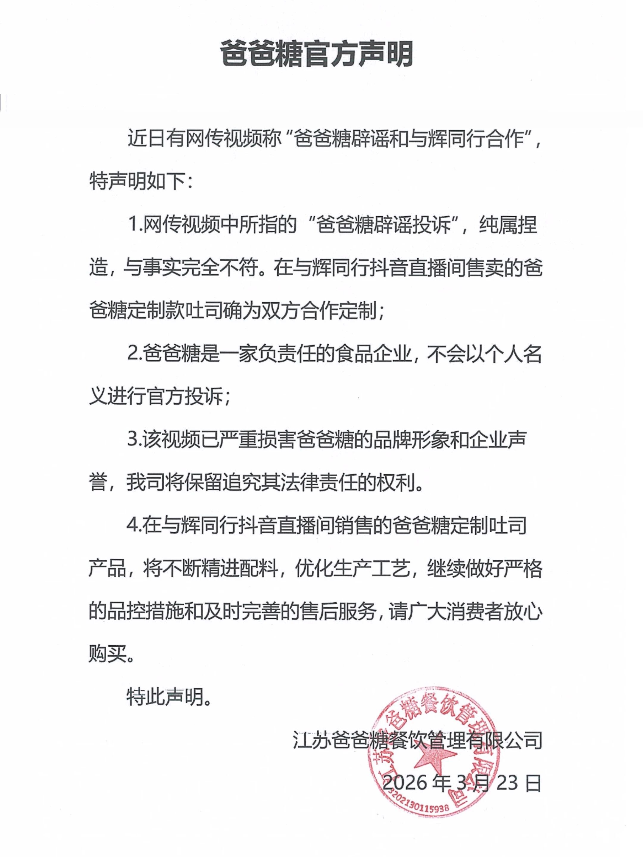 公开资料显示,爸爸糖与辉同行的合作始于2025年第四季度,双方联合推出的定制款吐司凭借差异化配方和主播个人影响力,迅速成为直播间爆款产品。此次辟谣声明发布后,相关话题登上社交平台热搜榜,引发消费者对食品行业网络谣言治理的广泛讨论。