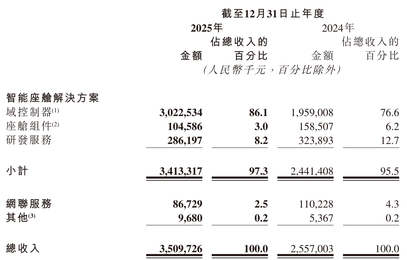 据财报披露,2025年博泰车联智能座舱域控制器的交付量达到130万台,较2024年增长超过40%。这一增长直接推动了公司智能座舱解决方案收入的攀升,该板块全年收入达34.13亿元,占公司总营收的97.3%。其中,域控制器收入为30.22亿元,占比86.1%;座舱组件收入为1.05亿元,占比3%;研发服务收入为2.86亿元,占比8.2%。