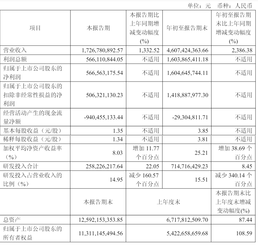 中科寒武纪科技股份有限公司(证券代码:688256,证券简称:寒武纪)今日正式披露最新财务报告。数据显示,公司2024年第三季度实现营业收入17.27亿元,同比增幅达1332.52%,当季净利润录得5.67亿元。从全年表现来看,前三个季度累计营收46.07亿元,较去年同期增长2386.38%,净利润总额达到16.05亿元,成功实现由亏转盈的战略目标。