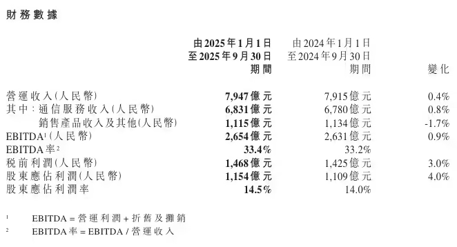 在盈利方面,中国移动前三季度的EBITDA(息税折旧摊销前利润)为2654亿元,同比增长0.9%。股东应占利润则达到1154亿元,增幅为4.0%,为股东创造了可观的价值。