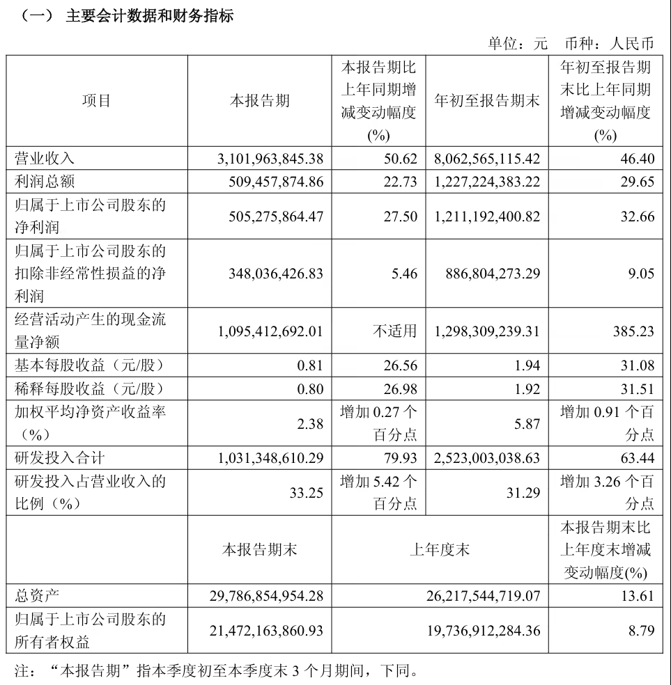 净利润增长的主要驱动力来自多方面。首先,营业收入增长46.40%带动毛利较上年增加约8.27亿元;其次,研发支出虽同比增加9.79亿元,但为公司长期发展提供了技术保障;市场波动导致公司计入非经常性损益的股权投资收益为3.29亿元,较上年同期增加约2.75亿元。