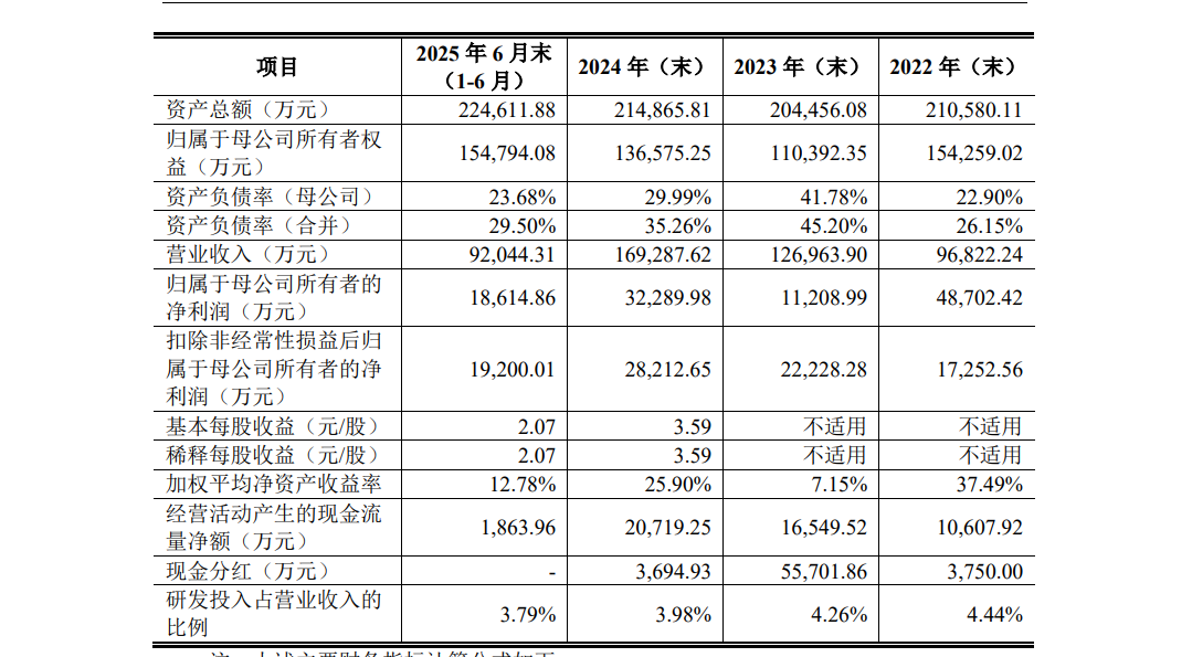 从财务数据来看,天博智能在报告期内(2022年至2025年上半年)展现出了较强的盈利能力。2022年,公司实现营业收入9.68亿元,归母净利润4.87亿元;到了2023年,营业收入增长至12.7亿元,归母净利润为1.12亿元;2024年,营业收入进一步提升至16.93亿元,归母净利润达到3.23亿元;而在2025年上半年,公司实现营业收入9.2亿元,归母净利润为1.86亿元。