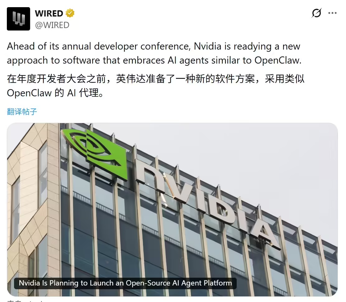 据科技媒体《连线》披露,英伟达计划在下周圣何塞举行的GTC开发者大会上,正式发布一款名为"NemoClaw"的开源AI智能体框架。这款产品最大的突破在于实现了硬件解耦设计——企业用户无需依赖英伟达专用芯片即可部署该平台,员工可通过智能体自动处理文档整理、会议安排等日常事务。