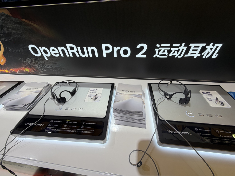 展台另一侧,韶音三大经典产品线——耳挂系列、后挂系列及耳夹系列悉数登场。包括OpenFit 2+、OpenRun Pro 2等明星产品,以及斩获CES 2026创新奖的耳夹式新品OpenDots ONE,共同展示了品牌在开放式音频领域的技术积淀。更引人注目的是两款首次在国内亮相的AI眼镜:OpenGuide AI集成实时语音导航与环境识别功能,OpenVision则通过骨传导技术实现私密音频传输,这两款产品标志着韶音正式进军智能穿戴生态领域。