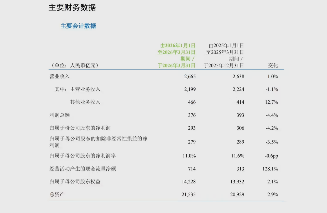 中国移动近日公布了其2026年第一季度的财务业绩报告,数据显示公司在多个关键指标上呈现分化态势。报告期内,公司实现营业收入2665亿元,较上年同期微增1.0%,其中主营业务收入为2199亿元,同比下降1.1%,而其他业务收入则实现12.7%的显著增长,达到466亿元。