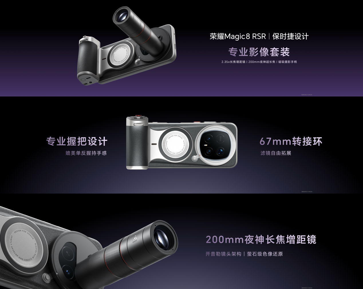 本次发布的荣耀 Magic8 RSR 保时捷设计专属影像套装,由泰迅深度定制开发,包含相机专业手柄、滤镜系统等核心配件,针对旗舰手机的影像特性做了三大升级: