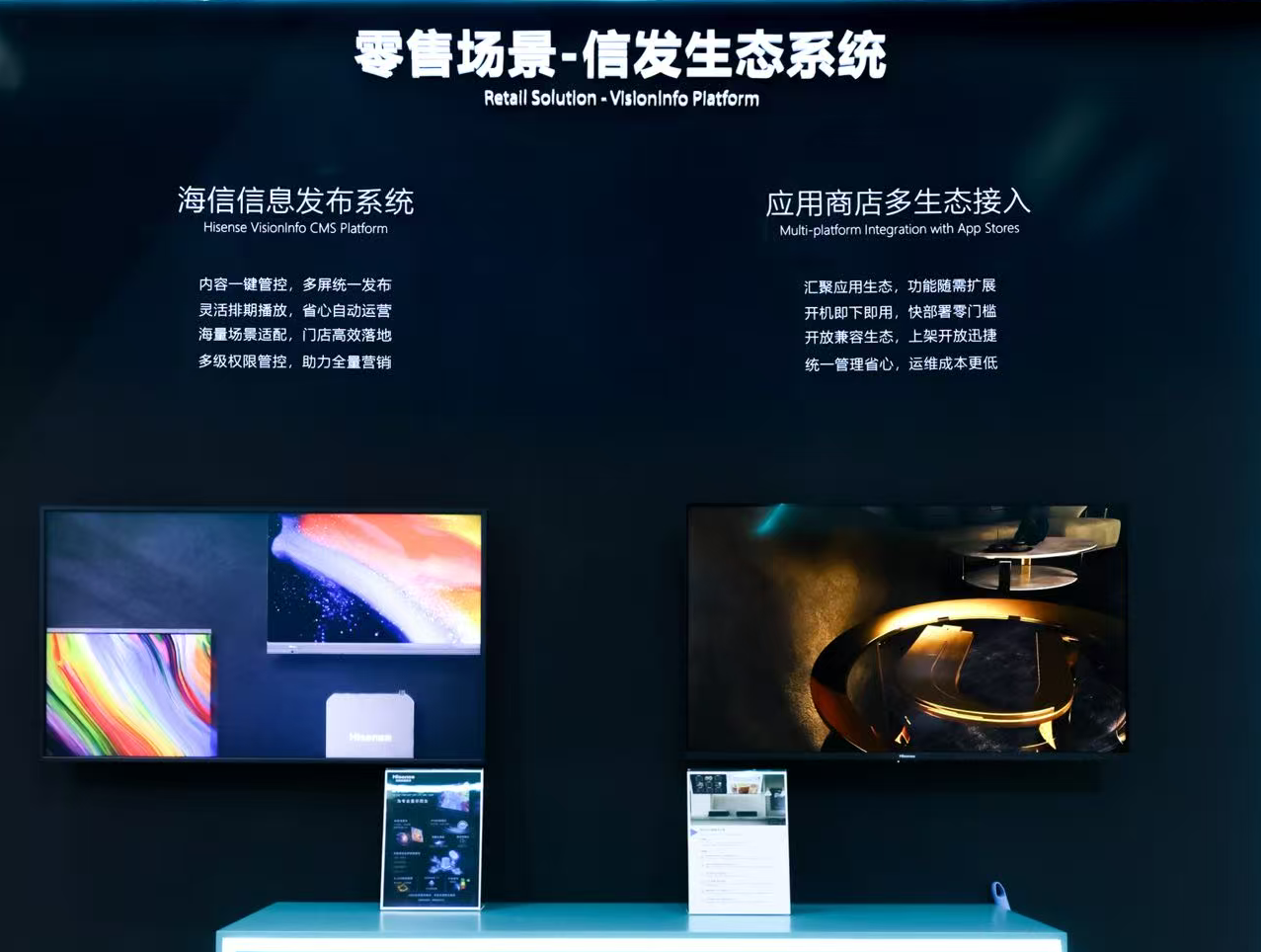 展会现场特设海信茶饮、快餐、折扣零食等零售场景展区,通过展示数字标牌产品与信发智控系统,打造“软硬”一体、便捷高效的零售行业数字化升级方案。依托 20 + 零售业态深度洞察,为全球茶咖、餐饮、鞋服、商超等泛零售品牌提供定制化商显服务,通过高清显示、智能内容管理、远程运维等能力,助力零售门店提升展示效果、降低运营成本、强化品牌形象。
