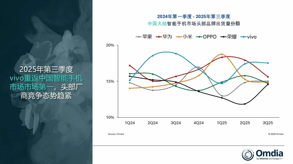 根据Omdia最新发布的市场研究报告,2025年第三季度中国大陆智能手机市场延续调整态势,整体出货量同比下降3%。在市场格局持续演变的背景下,头部品牌间的竞争激烈程度显著提升,各厂商市场份额差距进一步缩小。