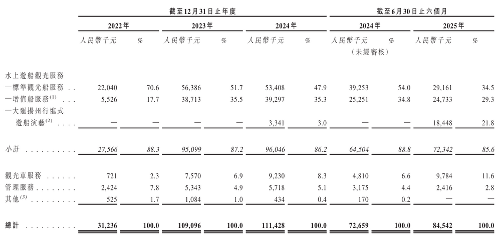 2025年上半年财务表现延续增长态势,实现营收8,454万元,较上年同期增长16.3%;期内利润达5,171万元,同比增长14.5%,利润率攀升至61.2%。从收入结构看,水上游船观光服务贡献核心收入7,234万元,占比85.6%,其中标准观光船服务收入2,916万元(34.5%)、增值船服务收入2,473万元(29.3%)、夜间游船演艺收入1,845万元(21.8%)。观光车服务与管理服务分别贡献978万元(11.6%)和242万元(2.8%)收入。