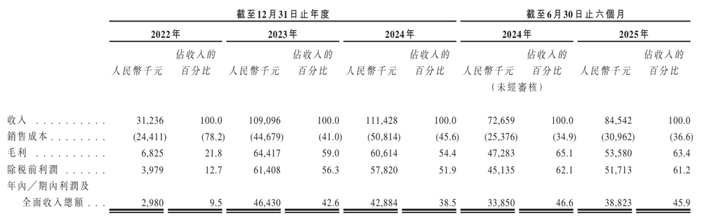 财务数据显示,2022年至2024年期间,公司营收从3,124万元跃升至1.11亿元,期内利润由298万元增至4,288万元。值得注意的是,毛利率从2022年的21.8%大幅提升至2023年的59%,2024年虽略有回落至54.4%,但仍保持高位。其中,2023年成为业绩爆发年,营收与利润分别实现252%和1457%的同比增长。