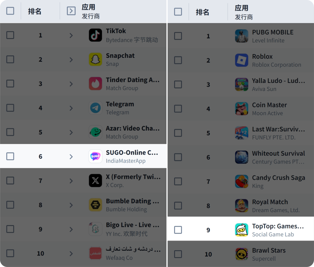 第三方数据平台Sensor Tower的统计显示,2025年1月至9月期间,赤子城科技旗下产品在中东地区表现突出。其中,社交应用SUGO在中东地区社交网络App收入榜中位居第六,而游戏应用TopTop则在Google Play游戏App收入榜中排名第九,彰显了公司在区域市场的领先地位。