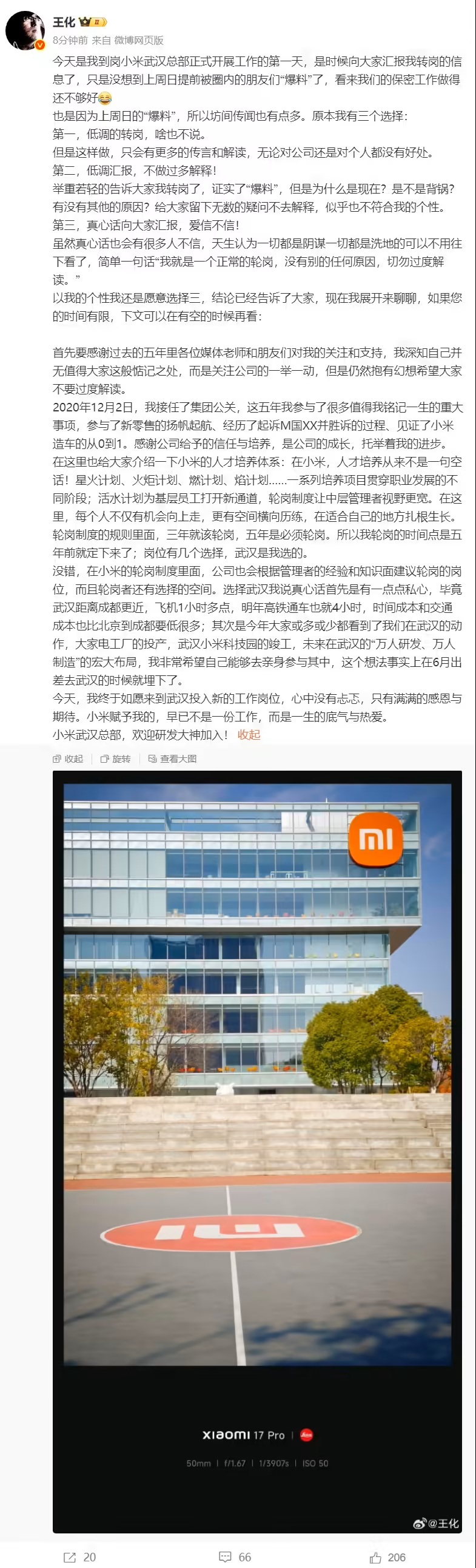 小米集团公关部总经理王化近日通过社交平台正式确认,其已调任至小米武汉总部任职。他在公开分享中提到,原本计划低调完成岗位调整,但因上周日提前被业内人士曝光,引发诸多猜测,因此决定坦诚说明情况。