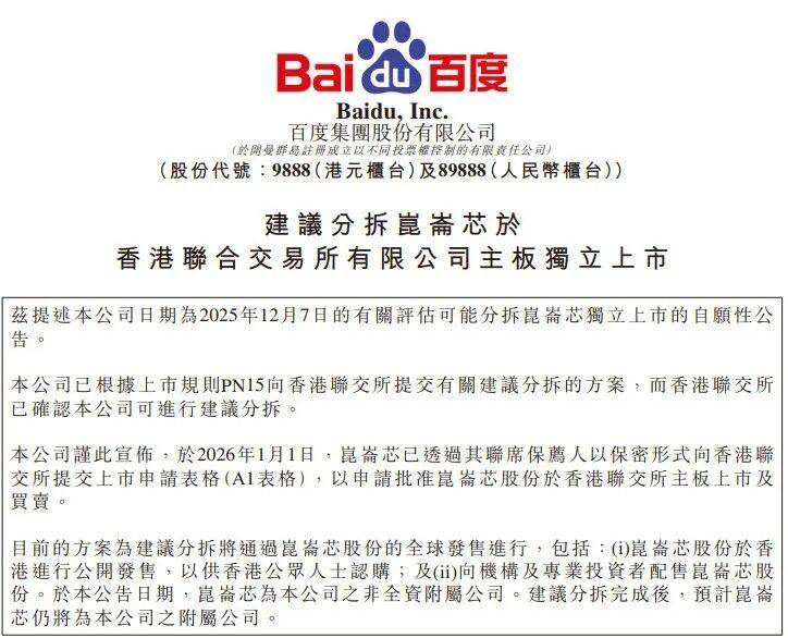 新年伊始,资本市场因一则分拆上市消息掀起波澜。百度旗下AI芯片业务主体昆仑芯,以保密形式向香港联交所递交上市申请的公告披露后,百度美股股价单日飙升15%,创下近期涨幅纪录。这场资本市场的热烈反应,将公众目光引向百度长期布局的硬核技术领域。