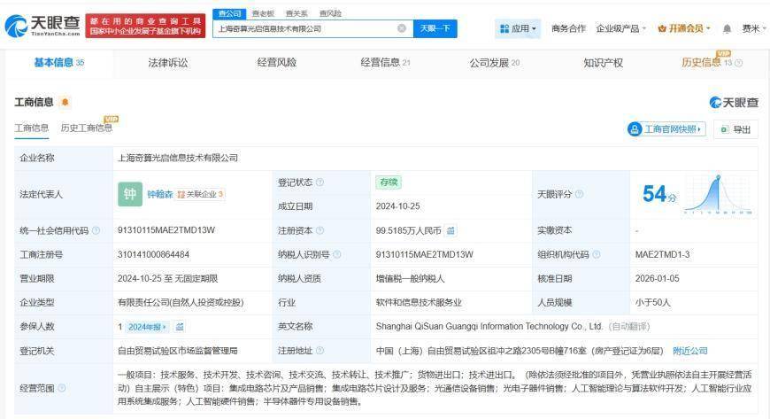 公开资料显示,上海奇算光启成立于2024年10月,法定代表人为钟翰森,核心业务聚焦于光计算芯片领域。公司致力于通过技术创新突破传统电子芯片的算力限制,为人工智能、高性能计算及大数据处理提供硬件层面的颠覆性解决方案。其经营范围涵盖人工智能行业应用系统集成、人工智能硬件销售以及半导体器件专用设备销售等领域,显示出技术驱动与市场应用并重的发展策略。