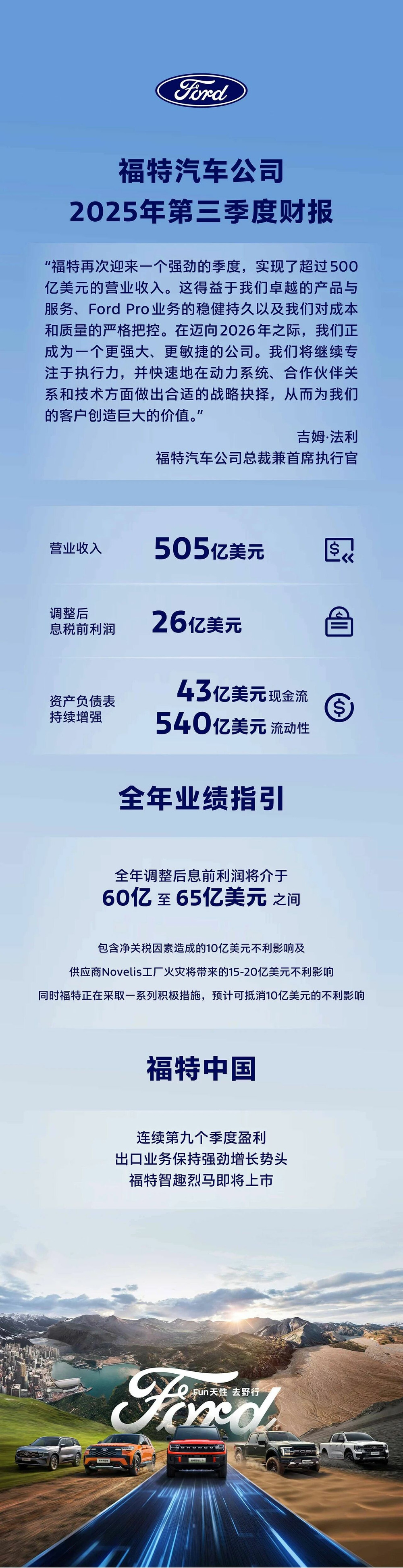 值得关注的是,福特中国业务持续保持强劲增长态势,已连续九个季度实现盈利。其出口业务表现尤为突出,成为带动整体业绩提升的重要引擎。这一成绩反映出福特在中国市场的战略调整已初见成效,特别是在新能源转型和供应链优化方面的布局开始显现价值。