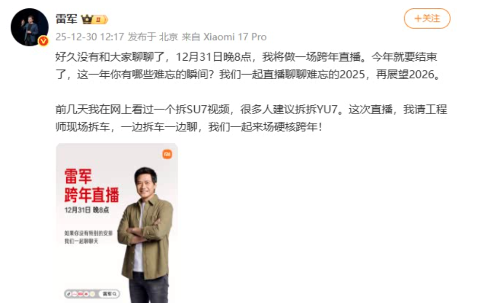 小米科技创始人、董事长兼CEO雷军近日通过社交媒体平台宣布,将于12月31日晚上8点开启一场特别的跨年直播活动。此次直播延续了其去年同期的互动形式,但内容设计上更具技术深度。