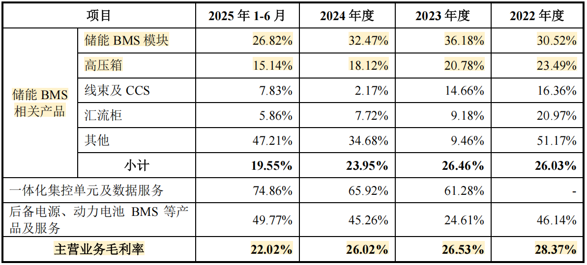然而,公司毛利率呈现下滑趋势。2022年至2024年,主营业务毛利率分别为28.37%、26.53%和26.02%,2025年上半年骤降至22.02%。公司解释称,这主要由于毛利率较高的BMS模块产品售价及销售收入占比下降所致。