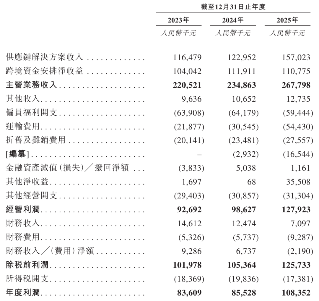 财务数据显示,2023至2025年间,企业营收呈现稳步增长态势,分别录得2.21亿元、2.35亿元及2.68亿元。同期经营利润由9269万元增至1.28亿元,净利润则从8361万元提升至1.08亿元,展现出较强的盈利韧性。值得注意的是,2024年供应链解决方案贡献1.57亿元收入,跨境资金服务则带来1.1亿元净收益,形成双轮驱动的业务结构。