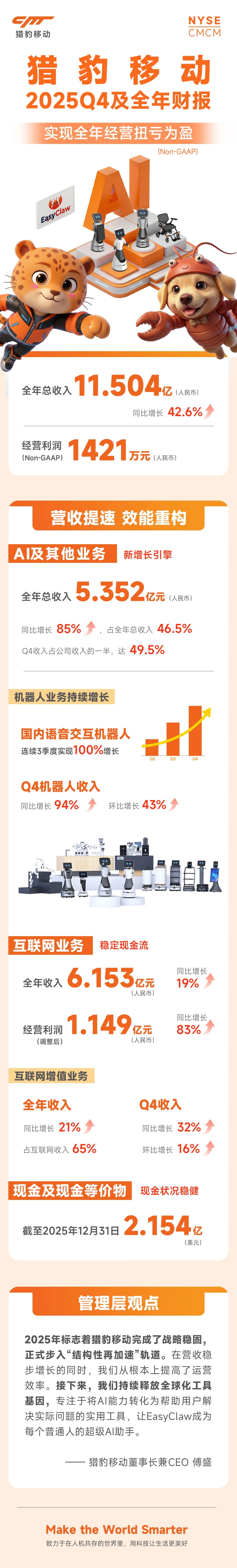 猎豹移动近日公布的最新财报显示,公司在2025年实现了显著的业绩突破。全年总收入达到11.504亿元,较上一年度增长42.6%,Non-GAAP营业利润录得1421万元,标志着公司正式摆脱亏损困境,经营效率得到实质性提升。