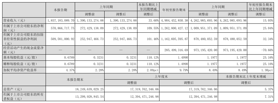 分季度来看,2025年第三季度公司经营表现尤为突出。该季度实现营业收入18.57亿元,同比增长33.60%;净利润达到5.71亿元,同比增幅高达109.55%。基本每股收益为0.6789元,较上年同期显著提升。