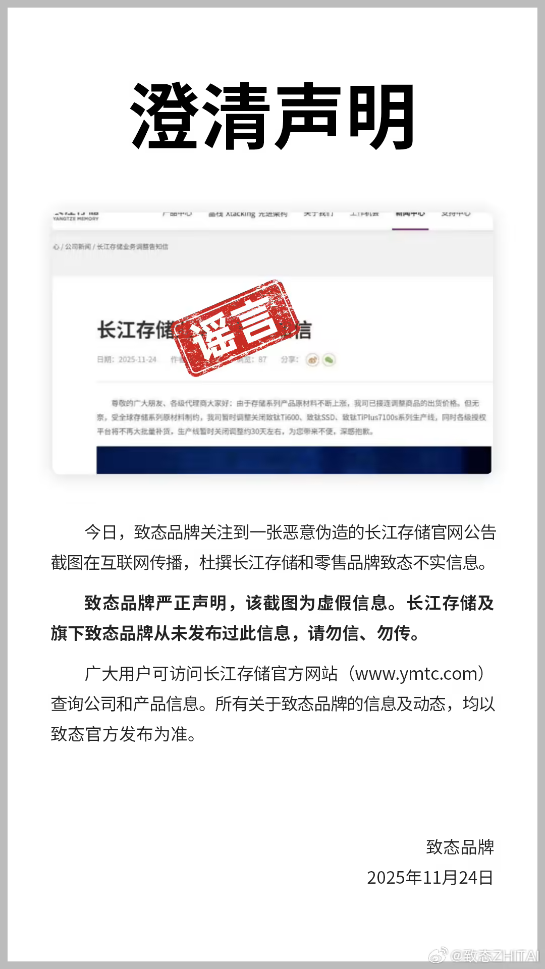 针对这一虚假信息,致态品牌严正声明,长江存储及其旗下致态品牌从未发布过此类公告,相关内容完全不属实。品牌方呼吁广大用户保持理性,切勿轻信或传播此类未经证实的消息,以免造成不必要的误解和恐慌。