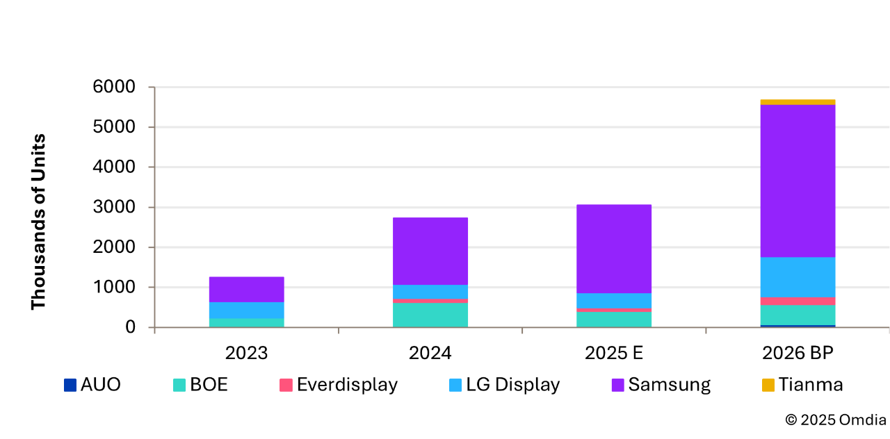 供应链集中度维持高位特征。三星显示凭借刚性OLED的规模生产优势,预计2025年将占据全球70%以上市场份额,京东方则以低两位数份额位居第二。2026年市场格局或现变化,欧洲车企的新增需求将持续支撑三星领先地位,而LG显示随着多个量产项目落地,市场份额有望显著提升。这种竞争态势将推动面板厂商加速技术迭代,进一步优化成本结构。