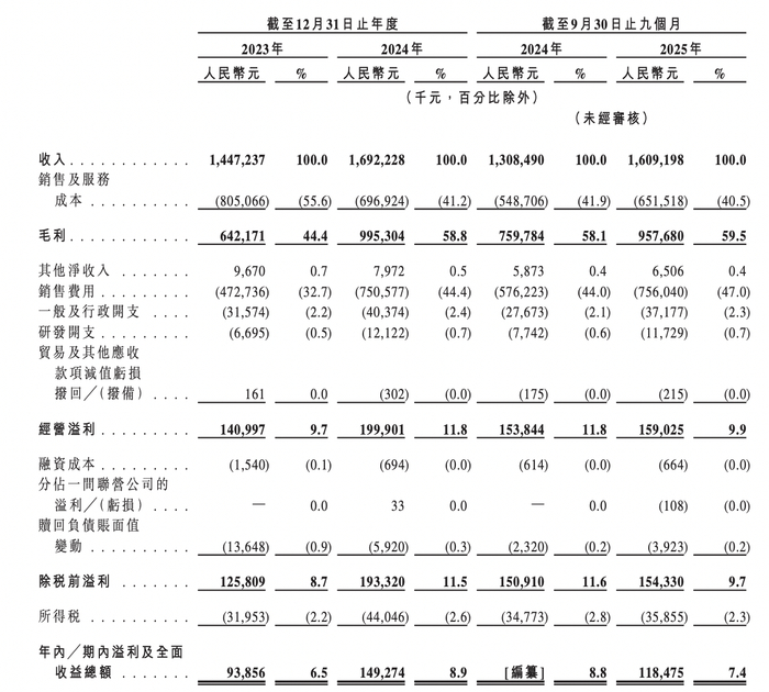 根据弗若斯特沙利文的数据,以2024年运动营养食品零售额计算,西子健康在中国品牌运营商中排名第三,同时也是2022年至2024年增长最快的品牌营运商。财务数据显示,2023年至2025年前9月,公司收入分别为14.47亿元、16.92亿元和16.09亿元;同期溢利及全面收益总额分别为9385.6万元、1.49亿元和1.18亿元,毛利率从44.4%提升至59.5%,盈利能力持续增强。