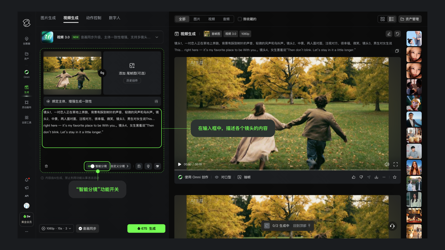 叙事能力实现质的飞跃是本次升级的显著特征。视频模型支持最长15秒的连续生成,内置智能分镜系统可自动完成镜头调度与景别转换。创作者通过简单的参数调整,即可实现"正反打"对话、跨场景转场等复杂叙事结构,镜头语言的表现力较前代提升40%以上。在音画同步领域,模型突破多语言适配瓶颈,不仅支持中英日韩西等主流语言,还涵盖粤语、川渝方言等20余种地方口音,人物口型匹配精度达到98.7%,情感表达自然度获得专业影视从业者认可。