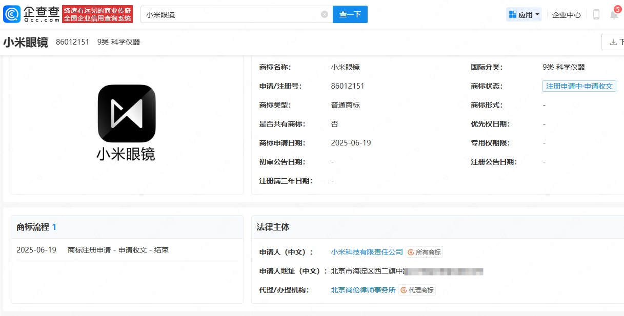 企查查APP显示,近日,小米科技有限责任公司申请注册“小米眼镜”商标,国际分类为科学仪器,当前商标状态为注册申请中。据此前报道,小米集团创始人、董事长兼CEO雷军在今年6月发布了小米眼镜AI Glasses,可实现扫码支付、翻译、拍照等功能。