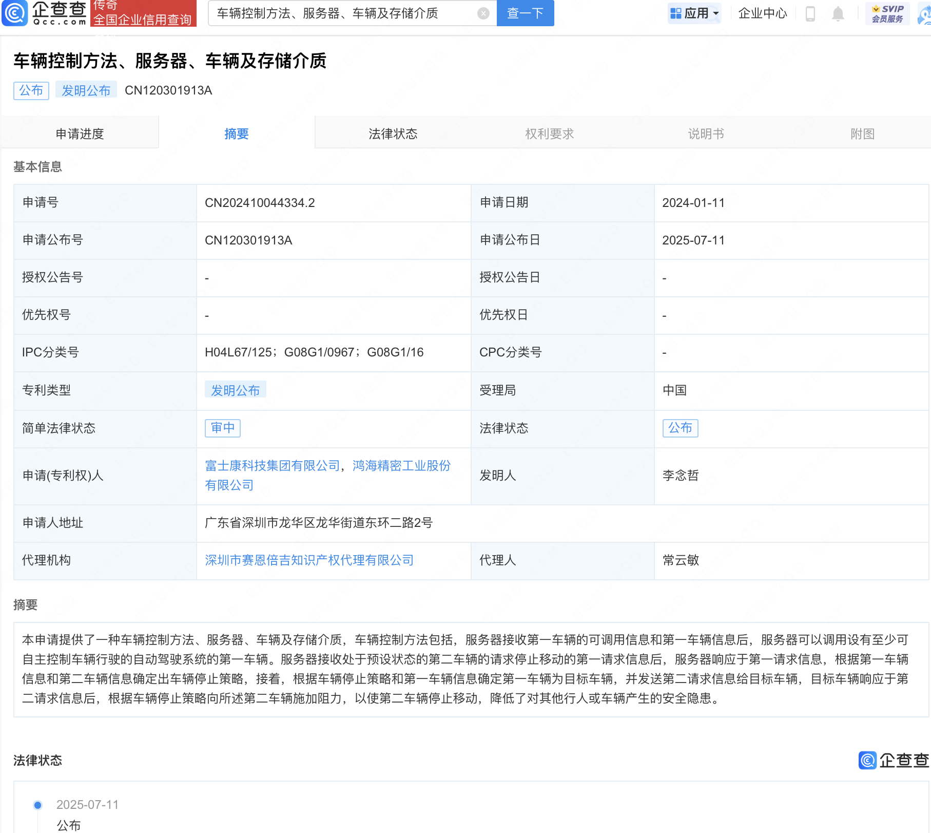 企查查APP显示,近日,富士康科技集团有限公司、鸿海精密工业股份有限公司申请的“车辆控制方法、服务器、车辆及存储介质”专利公布。企查查专利摘要显示,车辆控制方法包括,服务器接收第一车辆的可调用信息和第一车辆信息后,服务器可以调用设有至少可自主控制车辆行驶的自动驾驶系统的第一车辆。服务器接收处于预设状态的第二车辆的请求停止移动的第一请求信息后,服务器响应于第一请求信息,根据第一车辆信息和第二车辆信息确定出车辆停止策略,接着,根据车辆停止策略和第一车辆信息确定第一车辆为目标车辆,并发送第二请求信息给目标车辆,目标车辆响应于第二请求信息后,根据车辆停止策略向所述第二车辆施加阻力,以使第二车辆停止移动,降低了对其他行人或车辆产生的安全隐患。