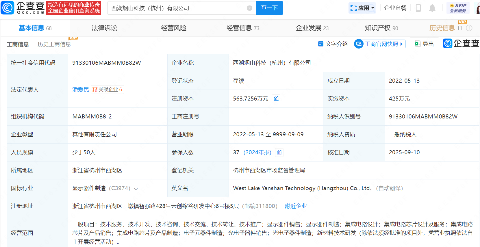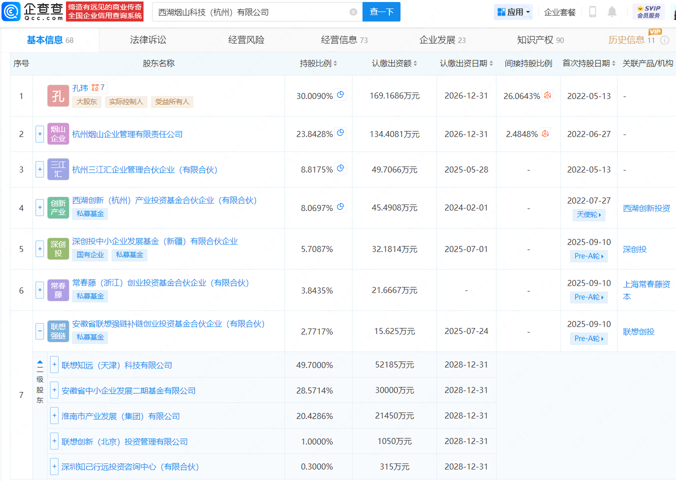 企查查APP显示,近日,西湖烟山科技(杭州)有限公司发生工商变更,新增联想创投旗下安徽省联想强链补链创业投资基金合伙企业(有限合伙)、深圳市创新资本投资有限公司、常春藤(浙江)创业投资基金合伙企业(有限合伙)等为股东,注册资本由500万元增至约564万元,同时多位主要人员发生变更。企查查信息显示,西湖烟山科技(杭州)有限公司成立于2022年5月,法定代表人为潘爱民,经营范围包含显示器件销售、显示器件制造、集成电路设计等,现由孔玮、杭州烟山企业管理有限责任公司及上述新增股东等共同持股。公开信息显示,该公司致力于全新一代MicroLED显示技术的开发,提供高亮度、高光效、低能耗、宽色域和长寿命的全彩显示芯片。