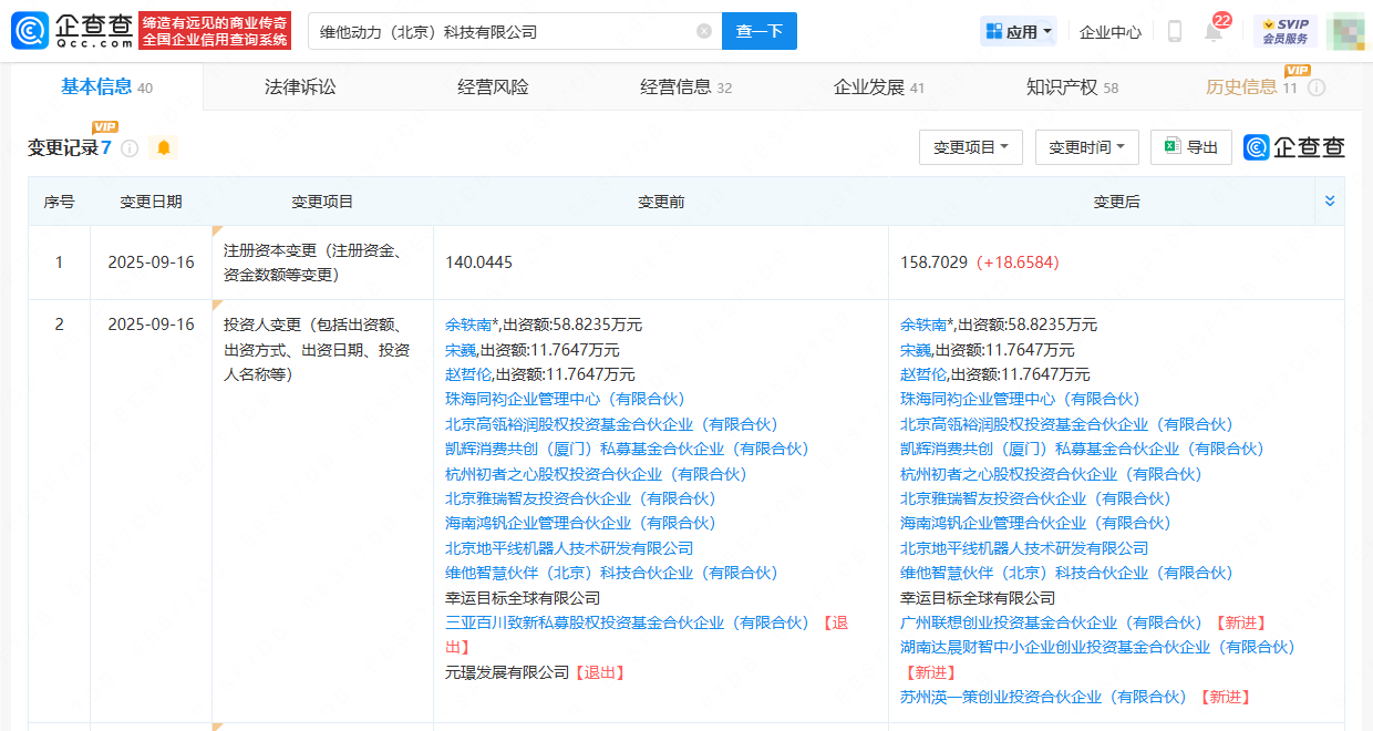 企查查APP显示,近日,维他动力(北京)科技有限公司发生工商变更,新增联想创投旗下广州联想创业投资基金合伙企业(有限合伙)、湖南达晨财智中小企业创业投资基金合伙企业(有限合伙)、苏州渶一策创业投资合伙企业(有限合伙)为股东,同时注册资本由约140万人民币增至约159万人民币。企查查信息显示,维他动力(北京)科技有限公司成立于2024年12月,法定代表人为余轶南,经营范围包括智能机器人的研发、智能机器人销售、工业机器人制造等,此前已获地平线机器人、高瓴创投等多方投资。