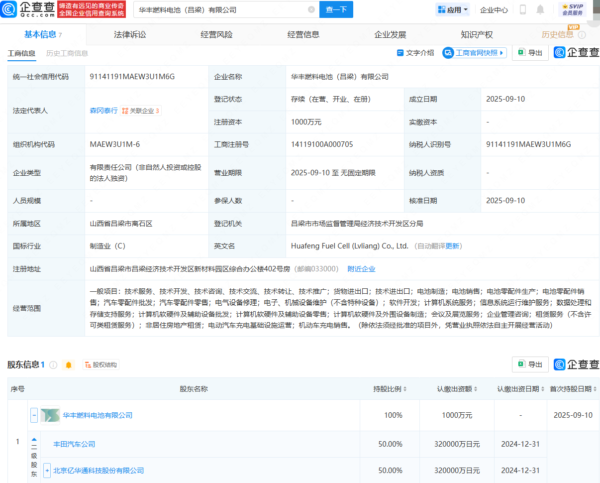 企查查APP显示,近日,华丰燃料电池(吕梁)有限公司成立,法定代表人为森冈泰行,注册资本为1000万元,经营范围包含:电池制造;电池销售;电池零配件生产;电池零配件销售;汽车零配件批发;汽车零配件零售等。企查查股权穿透显示,该公司由华丰燃料电池有限公司全资持股,后者由丰田汽车公司、亿华通(688339)共同持股。