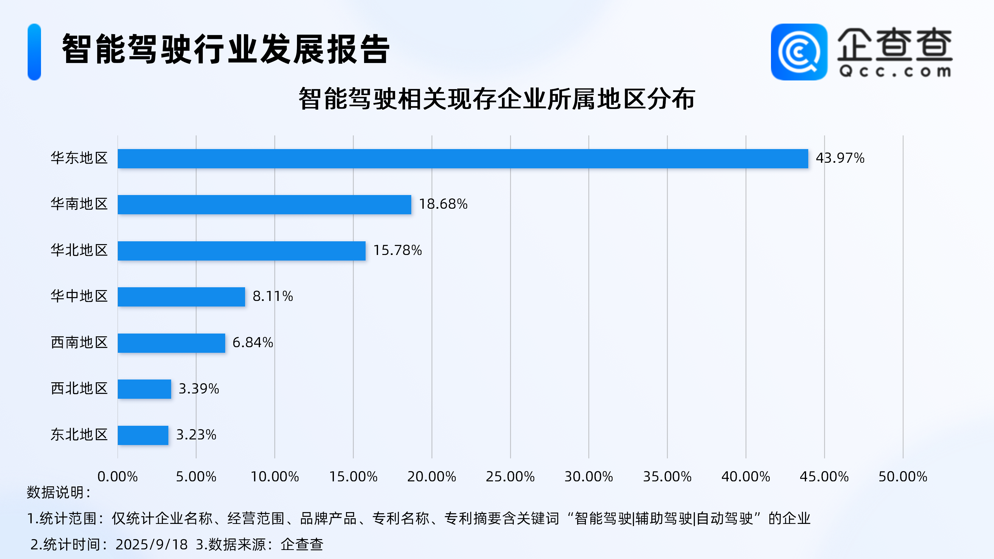 企查查数据显示,截至9月18日,国内智能驾驶相关企业现存量达7371家,主要分布在华东地区,占比达43.97%。其次为华南地区、华北地区,分别占比18.68%、15.78%。
