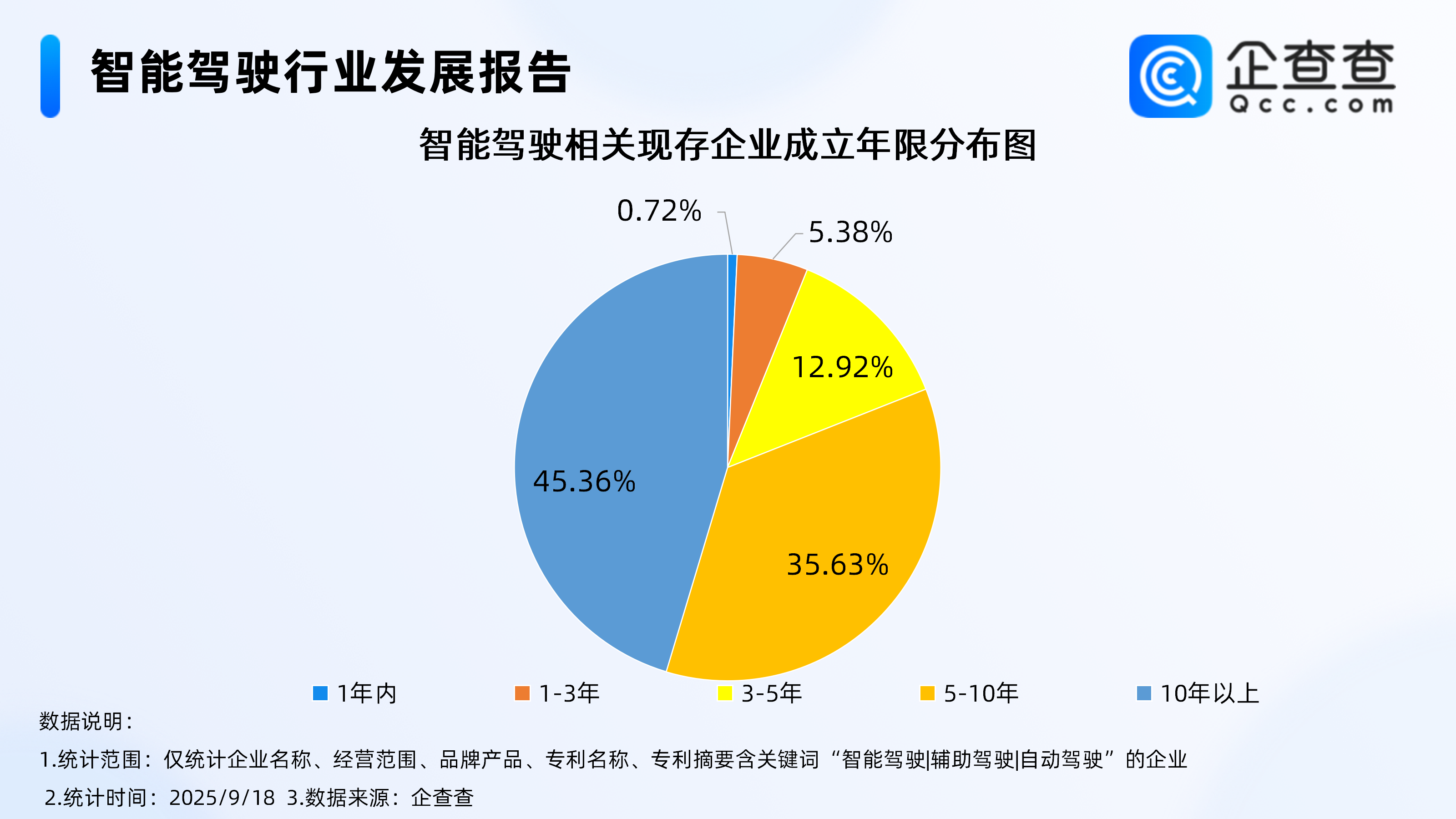 企查查数据显示,截至9月18日,国内智能驾驶相关企业现存量达7371家,主要分布在华东地区,占比达43.97%。从国标行业来看,超4成相关企业归属于科学研究和技术服务业,其次为制造业,占比达23.55%。从成立年限来看,超8成相关企业成立超5年,其中成立在10年以上的企业最多,占比达45.36%。注册量方面,截至目前,今年已注册31家相关企业。