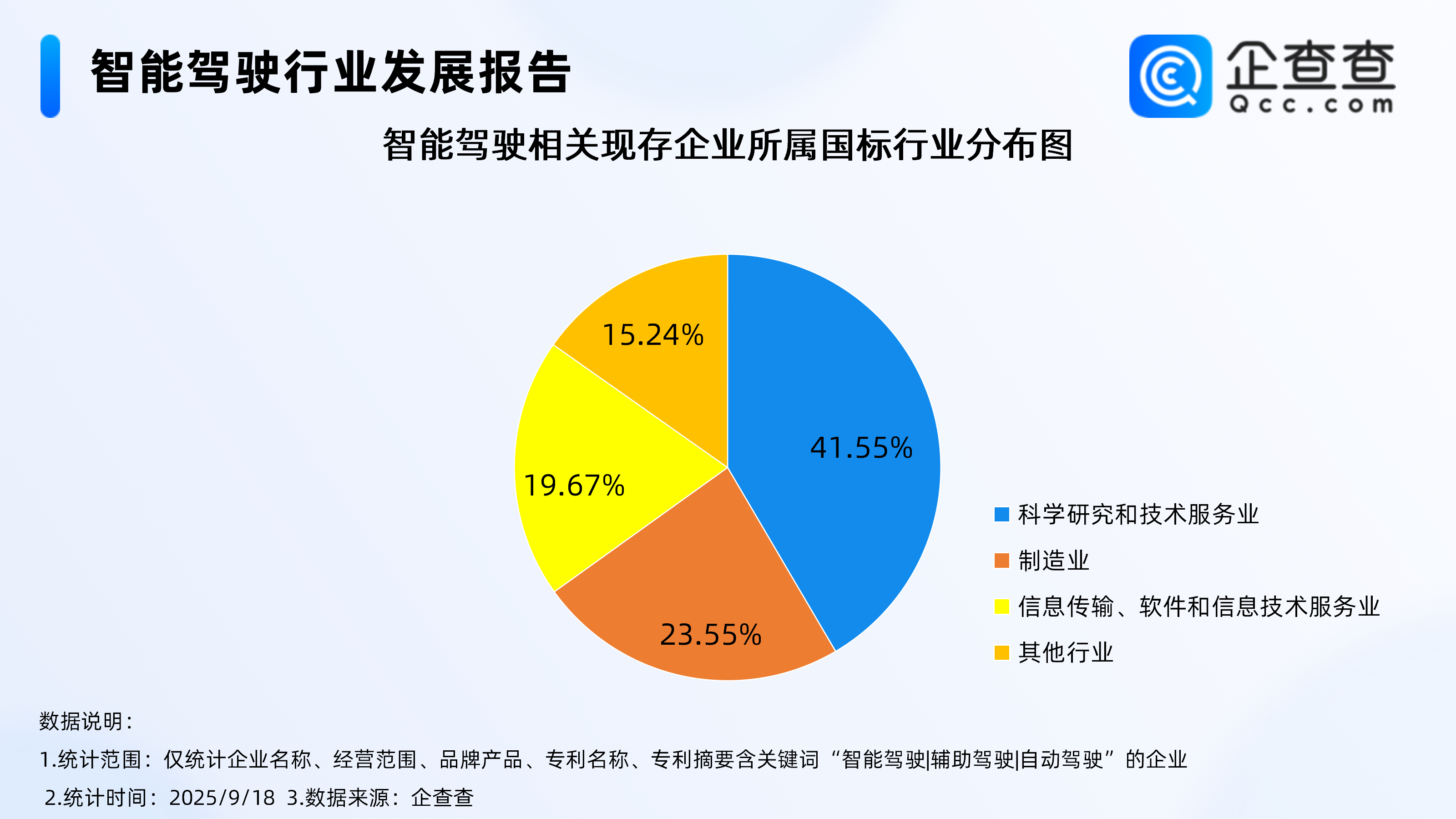 企查查数据显示,从国标行业来看,国内智能驾驶相关现存企业中,超4成相关企业归属于科学研究和技术服务业,占比达41.55%,其次为制造业,占比达23.55%,归属于信息传输、软件和信息技术服务业的相关企业,占比达19.67%。