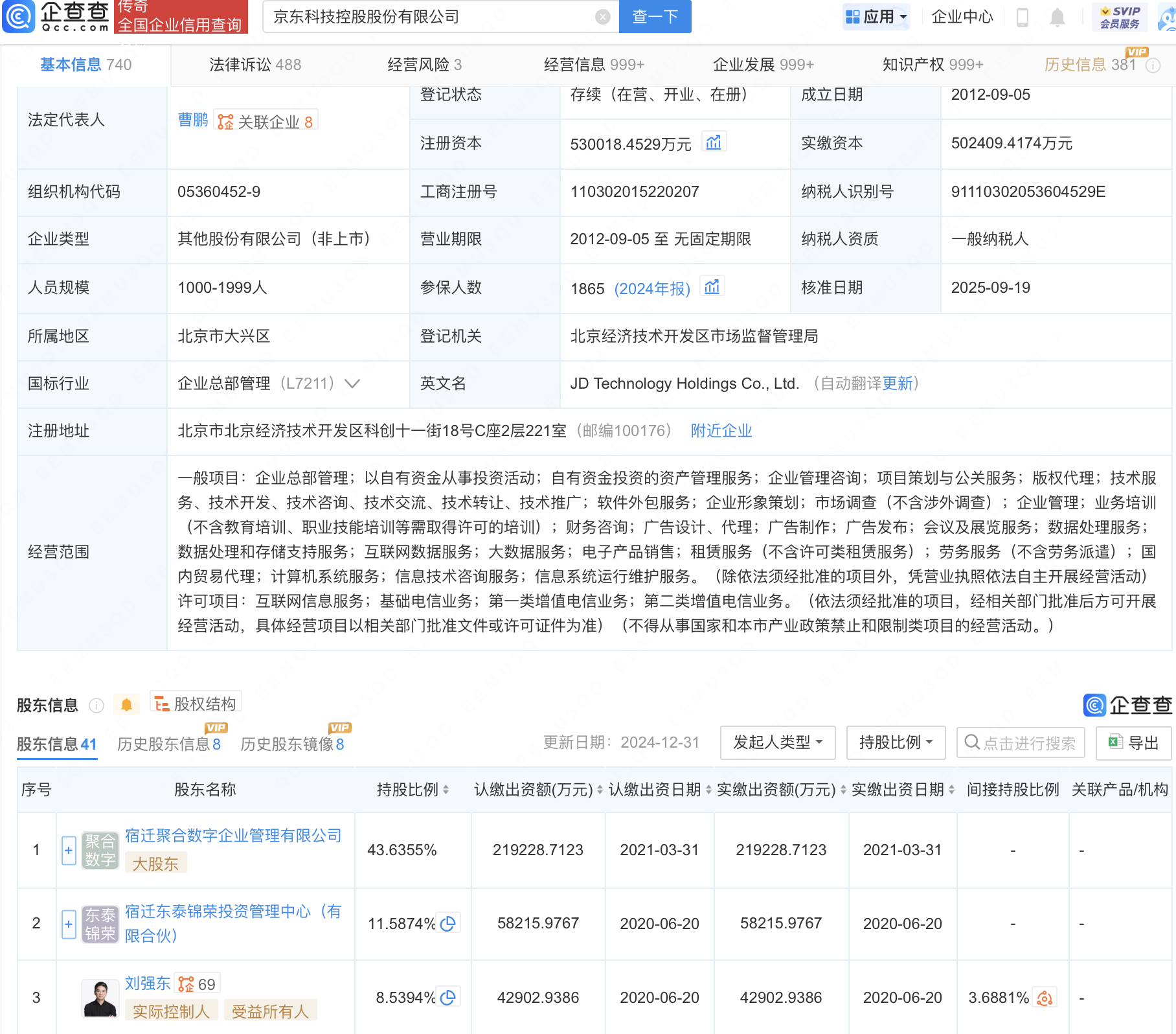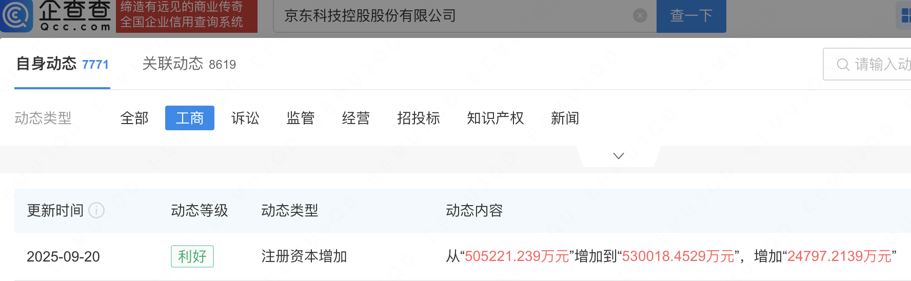 企查查APP显示,近日,京东科技控股股份有限公司发生工商变更,注册资本由50.52亿元增至53亿元。企查查信息显示,该公司成立于2012年,法定代表人为曹鹏,由宿迁聚合数字企业管理有限公司、刘强东等共同持股。