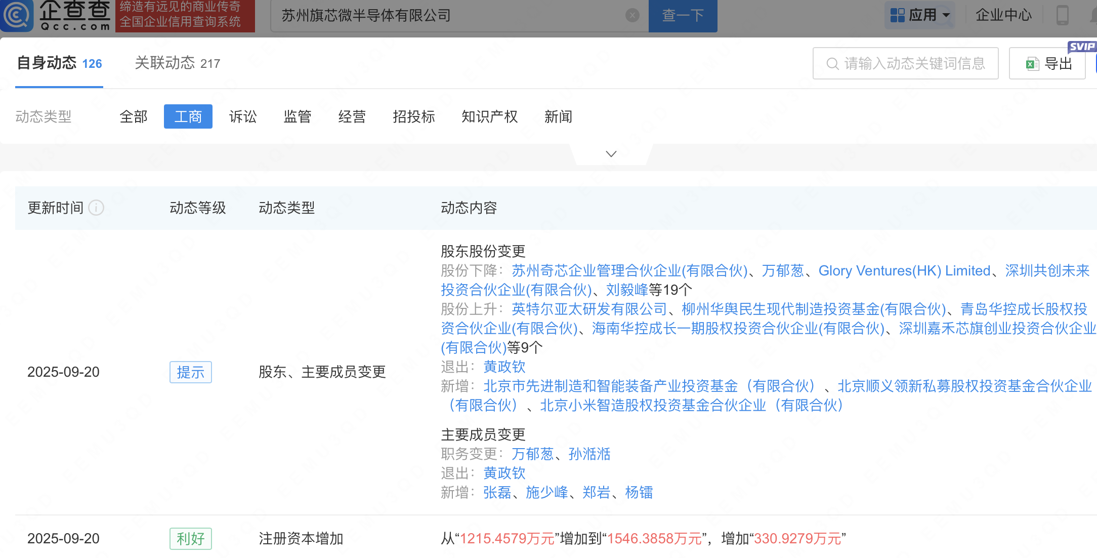 企查查APP显示,近日,苏州旗芯微半导体有限公司发生工商变更,新增北京小米智造股权投资基金合伙企业(有限合伙)等为股东,同时注册资本增至1546.39万元。企查查信息显示,该公司成立于2020年,经营范围包含:半导体器件专用设备销售;半导体分立器件销售;人工智能硬件销售;集成电路销售等。据其官网,该公司从事汽车高端控制器芯片的研发和销售。